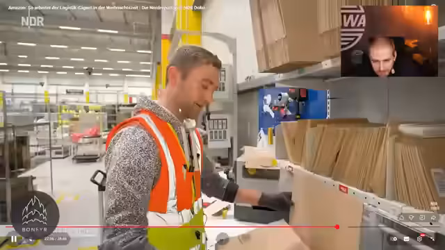05:04:44Während des Streams wird eine Dokumentation über Amazons Logistikzentren angesehen, wobei die Arbeitsabläufe und Herausforderungen in der Weihnachtszeit diskutiert werden. Die hohen Bestellzahlen und der Arbeitsdruck auf Mitarbeiter werden thematisiert, was zu einer kritischen Reflektion über die Arbeitsbedingungen bei Amazon führt.