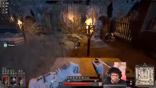 00:02:08Nach der Vorbereitung starten die Spieler in das Spiel und ziehen direkt zum Friedhof, einem early-game Gebiet. Dort stoßen sie auf ein Team bestehend aus einem Ranger, Warlock und Barden. Sie beschließen, das Team auszuspionieren und einen Angriff zu planen. Durch einen geschickten Flankenangriff gelingt es dem Streamer, den vermeintlich allein agierenden Wizard hinter dem Team zu eliminieren und anschließend mit der Beute abzuziehen.