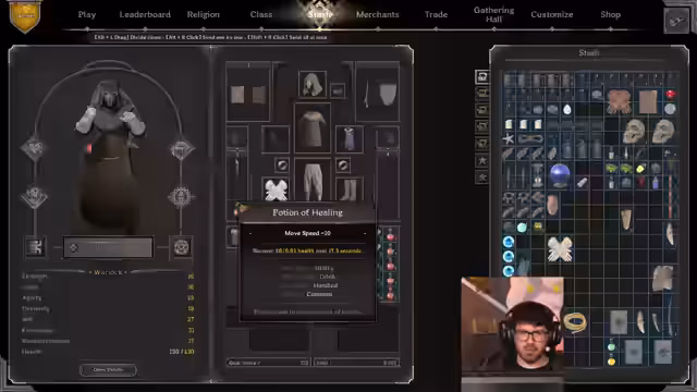 05:58:44Der Fokus wechselt zur Charakterentwicklung. Der Streamer erwägt, einen Cleric zu spielen, nachdem er diesen kürzlich durch Quests aufgestuft hat. Es folgt eine Diskussion über den Umgang mit gefundenen Gegenständen, insbesondere 'legendären' Ausrüstungsstücken. Er beschreibt sein System, Sets für verschiedene Charaktere zu bauen und überflüssiges Equipment zu verkaufen oder im Squire zu lagern, um Platz zu schaffen und Ressourcen effizient zu nutzen.