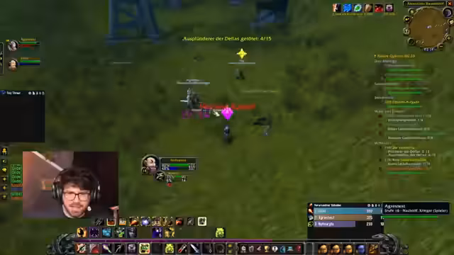 00:00:01Die Gruppe startet im Levelbereich 16-17 in Westfall und bewältigt erste Quests gegen Gnolle und Plünderer. Diskussionen über Fähigkeiten wie Rüstung zerreißen vs. Heldenhaften Stoß und Pet-Controlling dominieren. Fast-Todeserlebnisse durch hohe Level-Mobs wie Level 18-19 Caster unterstreichen die Hardcore-Herausforderung. Die Spieler koordinieren Angriffe und optimieren ihre Rotationen, während sie Gegenstände wie Gnolltatzen sammeln.