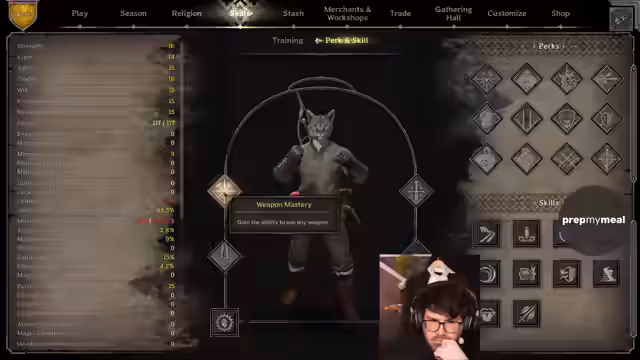 01:08:22Der Streamer zeigt seinen Level 15-Charakter, der als Fighter mit einem blauen Falken und spezifischen Perks wie 'Slayer' ausgestattet ist. Er erklärt, wie sein Build auf Repost-Angriffe fokussiert ist und welche Boni er durch Buffs und Ausrüstung erhält. Zudem wird über die Buyback-Funktion bei Händlern gesprochen, die das Verkaufen von Fehlkäufen verhindern.