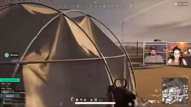 09:36:58Das Team erreicht die finale Zone, die stark schrumpft. Ein Spieler nutzt einen taktischen Trick, indem er sich sterben lässt, um das Spiel spannender zu gestalten. In der letzten Auseinandersetzung kämpfen die verbleibenden Spieler aus der gegnerischen Gruppe aus dem Haus heraus. Die Streamer schaffen es, die letzten Gegner auszuschalten und einen 'PUBG Win' zu erringen. Nach dem Sieg wird der Schaden und die Kill-Analyse der Runde besprochen, wobei sich Spieler über ihre Leistung gegenseitig aufziehen.
