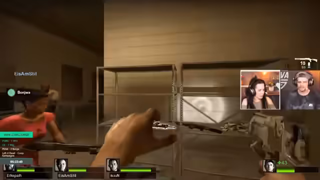 09:38:24Nachdem PUBG erfolgreich beendet ist, beschließt das Team, das Spiel zu wechseln. Es stellt sich heraus, dass 'Peak' nicht korrekt installiert oder funktioniert. Stattdessen wird Left 4 Dead 2 als nächstes Spiel gewählt. Nach längerem Download und einigen technischen Schwierigkeiten, bei denen das Spiel nicht startet, wird eine Lösung gefunden und das Spiel startet erfolgreich. Die Gruppe entscheidet, auf dem 'Expert'-Schwierigkeitslevel zu spielen und wählt die erste Kampagne.