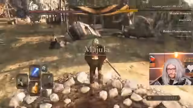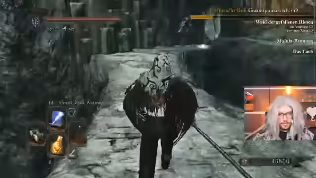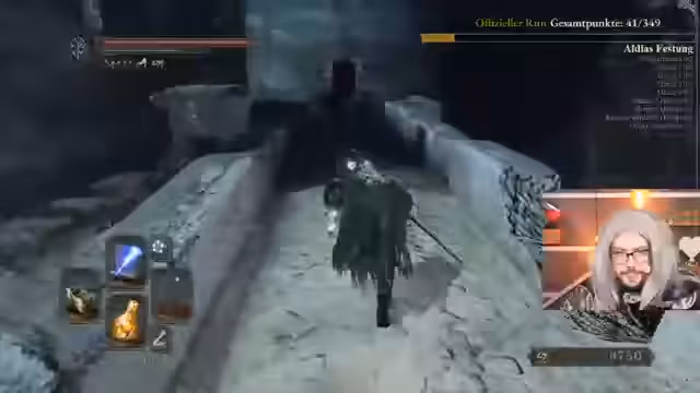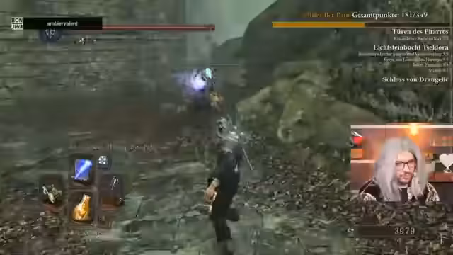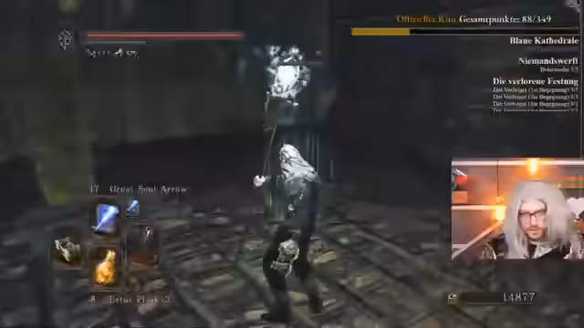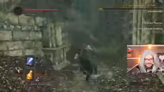 03:13:18In der Bastille trifft der Streamer auf den Verfolger, einen gefährlichen Boss, den er mit Vorsicht angeht. Er nutzt seinen stärksten Zauber, Homing Soulmass, um Schaden zu machen. Während des Kampfs wird er von einem Invasions-Phantom angegriffen, was den Kampf zusätzlich erschwert. Der Streamer erkennt, dass der Invasor stark ist und magieresistent, was seinen eigenen Schaden reduziert. Er muss taktisch klug vorgehen, um sowohl den Boss als auch den Invasor zu bezwingen.