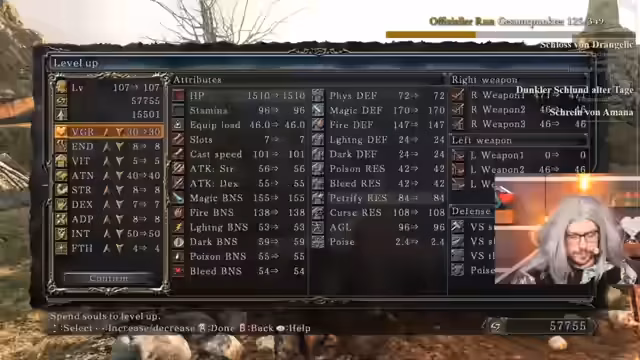 04:27:56Nach einer Pause wird der Fokus auf den aktuellen Soulkeeper's Run gelegt. Während des Streams wurde der Streamer von 'Hand of Blood' geraidet. Die Stimmung ist zunächst von Trauer über den unerwarteten Tod des Streamers Maximilian geprägt, der vor dem Dark Souls 3 Redemptions-Run verstarb. Der Streamer hofft auf einen erfolgreichen Run für Max. Man ist bereits drei Stunden im Spiel und hat sich als Hexer-Klasse auf Level 58 positioniert. Das Ziel ist es, zukünftig einen reinen Sorcerer zu spielen, sobald der 'Stab of Wisdom' gefunden wird. Der Fokus liegt auf einem sicheren und konservativen Spielstil, um das Überleben zu gewährleisten.