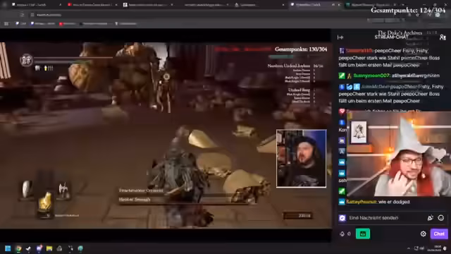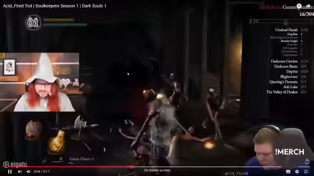 04:03:13Nachdem ein Clip von Edofe angesehen wurde, der in Dark Souls 1 gestorben ist, äußert sich Bedauern, aber auch Schadenfreude, da Edofe ihn wahrscheinlich aufgezogen hätte, wenn er länger überlebt hätte. Es wird ein tiefes Trauma verarbeitet und ein Bonfire aufgesucht. Der Chat wird aufgefordert, aufzustehen und sich zu bewegen, wenn er lange gesessen hat. Anschließend wird ein Clip von E2Ps Tod gegen den Black Knight analysiert, wobei dessen panische Reaktionen und missglückte Parry-Versuche hervorgehoben werden. Es wird festgestellt, dass E2P das Spiel übertrieben hat, da er Dark Souls zuvor noch nie gespielt hatte. Ein kurzer Blick auf die allgemeine Soulkeepers-Tabelle zeigt seine aktuelle Punktzahl und Position im Vergleich zu anderen Teilnehmern. Es wird kurz Malunas Run beobachtet, die ebenfalls zum ersten Mal Dark Souls 1 spielt und solide spielt.