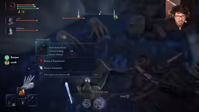 06:34:10Das Team entdeckt neue Charaktere im Elden-Ring-DLC, darunter 'Scholar' und 'Undertaker'. Sie diskutieren deren Fähigkeiten wie Debuffs via L2 und buffen durch spezielle Aktionen. Der Streamer analysiert Startwaffen mit Gift-Effekten und strategische Vorteile, während Unklarheiten über die Steuerung und die neuen Spielmechaniken bestehen, die intensiv erkundet werden.