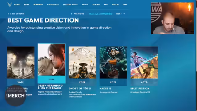 01:14:02Der Streamer diskutiert über fehlende Motivation für ein bestimmtes Spiel, obwohl es die Community wünscht, und kann daher nicht dafür stimmen. Stattdessen wählt er Jurassic World Evolution 3. Er analysiert auch die Nominierungen für verschiedene Kategorien, wie 'Best Sports Racing Game' und 'Best Multiplayer Game', bei denen er sich für Anno 2070 und Arc Raiders entscheidet. Bei der Kategorie 'Best Adaptation' zieht er die Splinter Cell Serie einer vermeintlich trashigen Until Dawn-Verfilmung und der The Last of Us Serie vor.