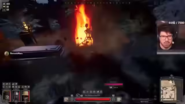 03:12:12Nachdem ein Boss-Spawn in einem benachbarten Raum gesichtet wurde, beginnt ein hektischer Kampf. Der Streamer kämpft gegen den schwarzen Goblin, wird aber von Gegnern wie Archern und einem Hund angegriffen und stirbt. Die Gruppe muss nun dringend einen Revive finden, bevor andere Teams die Leiche looten. Die Spannung steigt, da die Gegner aggressiv agieren und die Gruppe kurz davor ist, komplett ausgelöscht zu werden.