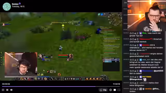 04:40:11Niklas analysiert Clips von Spieler Matteo, der häufig stirbt, weil er Quests nicht abgibt, in gefährliche Gebiete läuft oder Mobs nicht richtig managt. Der Chat und Niklas diskutieren humorvoll die Notwendigkeit, Matteo durch ständige Erinnerungen (z. B. an Buffs) zu unterstützen. Ein Clip zeigt, wie Matteo von einem Griefer angegriffen wird.