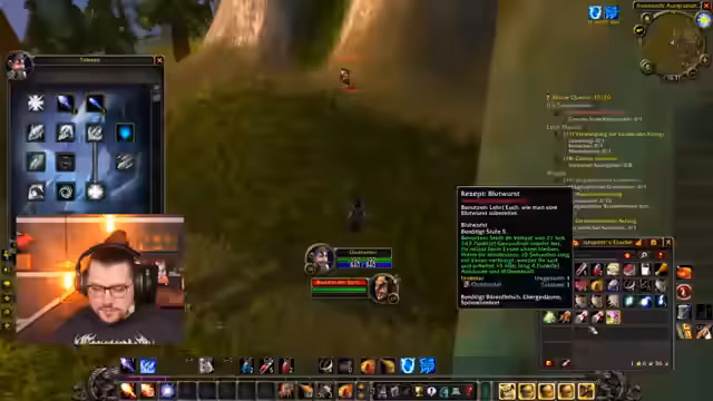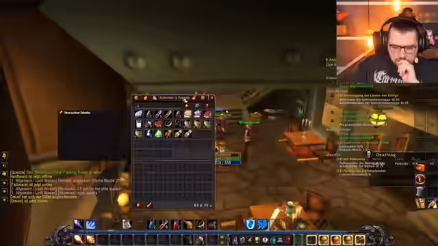 05:19:38Er liest das Buch für das Winterhauch-Fest, diskutiert Lebkuchen-Rezepte und sammelt Abzeichen. Dabei erfährt er von der Quest 'Inkantation der Manifestation', die drei gefüllte Verwahrungskästen in der Taverne zum Blauen Eremiten erfordert. Nach Questabgaben in Einforge plant er einen Flug nach Loch Modan zur Silbermine, um Rissedelsteine für eine Robe zu sammeln. Gleichzeitig verwaltet er sein Inventar, stellt Leinenstofftaschen her und optimiert sein Auftreten in Stormwind.