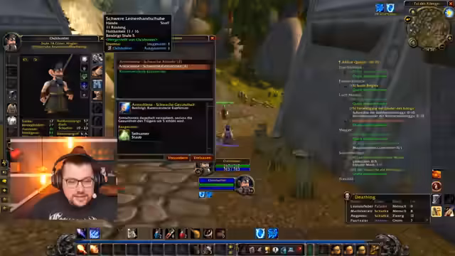 05:14:41Mit dem Add-on Questy passt er sein UI an, um Kampfmetriken wie Damage-Meter während Kämpfen hervorzuheben. Er stellt einen 'Geringen Magie-Sauerstab' her, der bei Manamangel nützlich ist, und diskutiert die Nutzung von 'Verzweiflung' als Waffe. Für den Deadmines-Dungeon plant er die Herstellung von Verbandmaterial und analysiert Quests in Einforge. Dabei priorisiert er persönliche Intuition gegenüber Guides, um das Spielerlebnis authentisch zu halten, und erwähnt Kooperationen mit anderen Spielern wie Kadhi oder Kapuzzi.