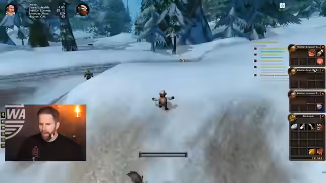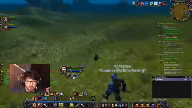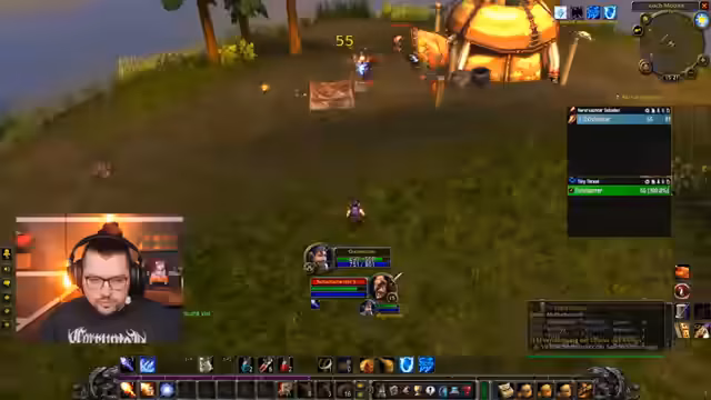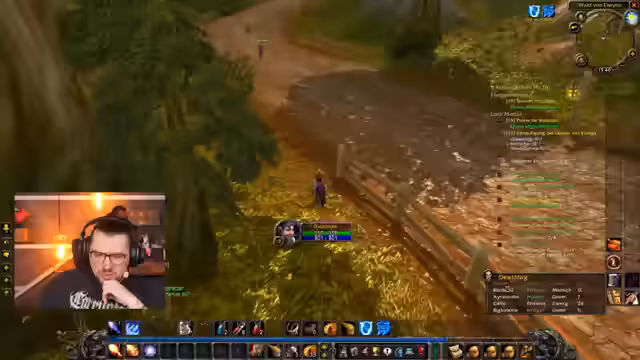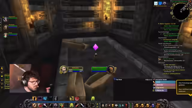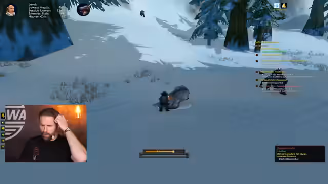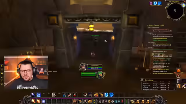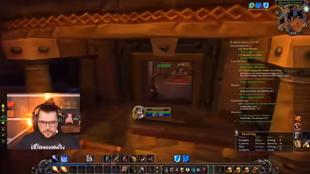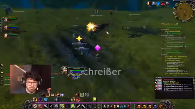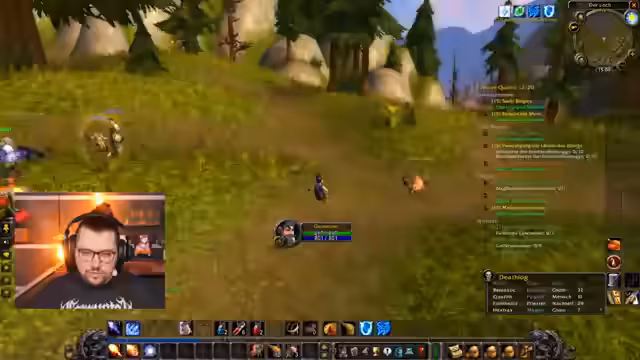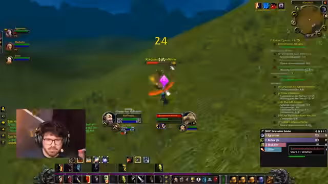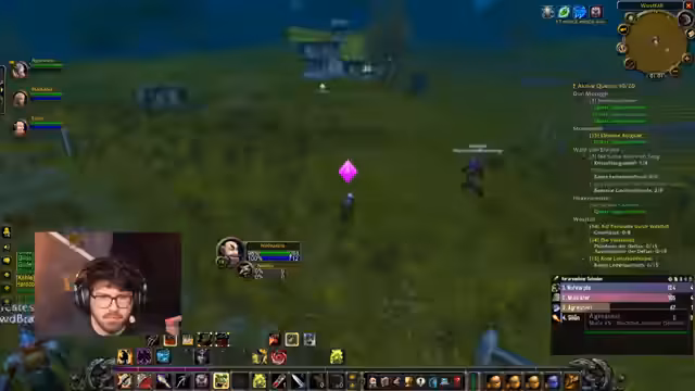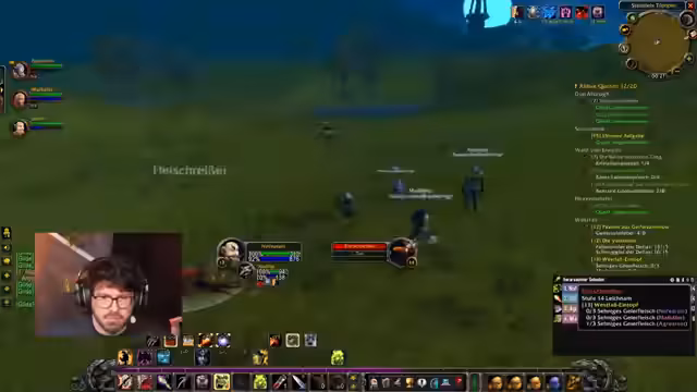 14:08:50Die Gruppe formt sich für World of Warcraft mit Daniel, Matteo und Leon. Es gibt Probleme mit Layering, da die Spieler in verschiedenen Instanzen sind. Sie treffen sich schließlich in der Taverne in Westfall. Später nutzen sie die Gilde, um Spieler einzuladen, nachdem Gruppenbildungsfehler gelöst werden. Sie diskutieren Save-Zones und die Gefahren von High-Level-Gebieten, während sie Quests vorbereiten.