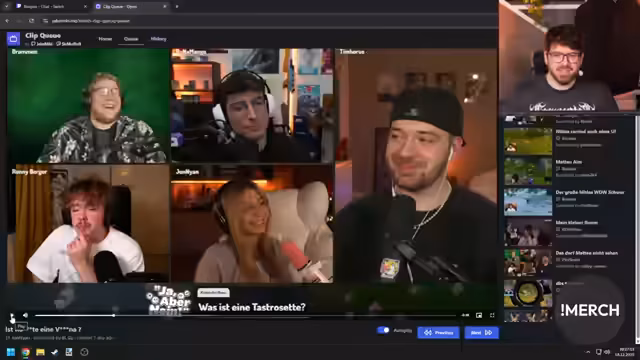 11:42:56Nach dem WoW-Segment wechselt die Unterhaltung zu Arc Raiders, wobei der Spieler erklärt, dass WoW seine Motivation für andere Spiele vollständig absorbiert hat. Es folgt eine humorvolle Diskussion über private Twitch-Sehgewohnheiten, bei der Kim als heimliche Fangirl von Bonjwa erwähnt wird und die Runde ihre Lieblingsstreamer vergleicht. Ein Scherz über einen 'sexy Affen' bei Kim wird gemacht, gefolgt von einer Quizfrage über Wichsen, die auf Ablehnung stößt.