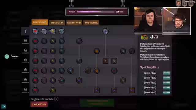 11:58:07Nach dem Start von Across the Obelisk erklärt die Gruppe die Grundmechaniken: Es handelt sich um ein Roguelike-Spiel mit einer Raid-Gruppe, die Klassen wie Krieger, Magier und Heiler wählt. Die Runde wählt Charaktere aus – Daniel als Tank, der Moderator als Ranger und Leon als Feuerball-Mage. Sie diskutieren Skill-Punkte-Verteilung und Deck-Modifikationen, wobei der Moderator einen gezielten Schuss kauft. Die Gruppe bereitet sich auf den ersten Kampf vor.