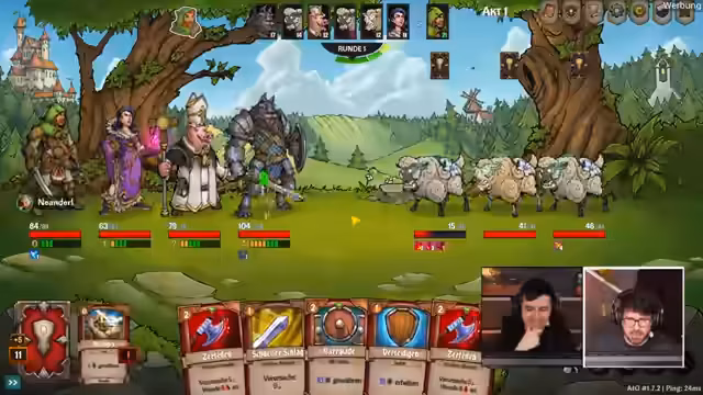 12:10:09Die Gruppe betritt ihren ersten Kampf gegen Schafe und lernt die Initiative- und Aktionspunkte-Mechanik kennen. Sie planen ihre Attacken, wobei der Moderator Schaden fügt und Leon mit AOE-Attacken unterstützt. Nach dem Sieg wählt die Gruppe Belohnungen aus, darater eine Karte mit Sicht-Effekt. Sie diskutieren über Elemental-Schwächen der Gegner und entscheiden sich für einen seltene Event-Route, wo sie auf Betty das Schaf treffen und eine moralische Entscheidung bezüglich ihrer Rückkehr zu den Besitzern treffen.