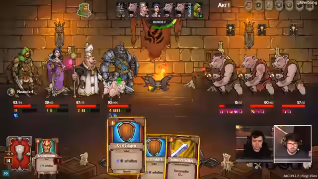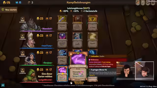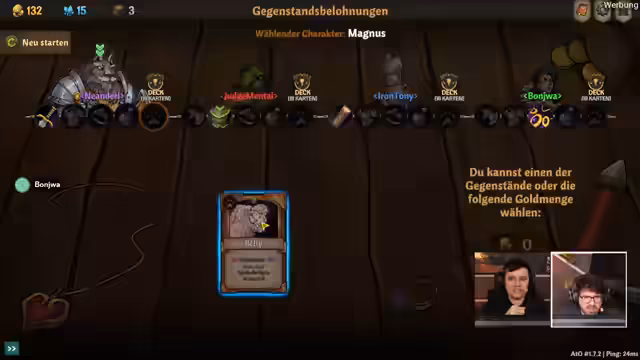 12:30:35Die Gruppe kämpft sich durch weitere Gegner, wobei sie ihre Deck-Strategien anpassen und Karten wie 'Wutanfall' einsetzen. Sie verwalten Ressourcen, diskutieren Heilungs- und Schadensstrategien und bewältigen einen schweren Kampf mit einem Boss. Nach dem Sieg wählen sie Belohnungen und diskutieren die Meta-Progression. Der Moderator kündigt an, dass sie das Spiel fortsetzen werden und verabschiedet sich schließlich von den Zuschauern.