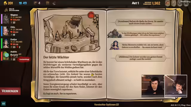 13:41:47Nach der Begegnung mit den Wölfen erreicht das Team das versteckte Dryaden-Versteck, wo es auf einen 'versteckten Triaden' trifft. Dort finden sie zahlreiche Beutestücke, darunter ein 'Ruby-Amulett' und eine 'Forest Crown'. Das Team diskutiert die Verteilung der Beute und trifft strategische Entscheidungen für die Ausrüstung, wobei Geschwindigkeit und Schaden im Fokus stehen. Anschließend bereitet sich das Team auf den Endboss vor, plant den Einsatz von Feuer und bespricht die Notwendigkeit von Heilung und defensiven Maßnahmen. Ein Ambush-Versuch schlägt fehl, was zu einer kritischen Situation mit starkem Schaden durch Verbrennungen führt, jedoch mit einer Taktik aus Jäger-Mal und gezielten Angriffen gemeistert wird.