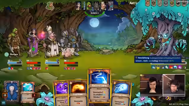 13:00:59Nach dem Kampf wird das Belohnungssystem genutzt, um Karten zu upgraden oder zu modifizieren. Das Team diskutiert detailliert die Vor- und Nachteile verschiedener Upgrade-Pfade, insbesondere im Hinblick auf Karten wie 'Viperstrike' und 'Toxischer Regen'. Dabei geht es um Kosten (Shards vs. Gold), den Einfluss auf das Deck-Building und strategische Aspekte wie das Entfernen unerwünschter Karten. Anschließend wird der Dungeon fortgesetzt, wo das Team auf einen höheren Dämon namens Belfior trifft. Dieser Kampf erfordert eine präzise Ressourcenverwaltung, da der Dämon trotz Schwächung durch eine fehlerhafte Beschwörung gefährlich ist und das Team neue Fähigkeiten und Buffs einsetzen muss.