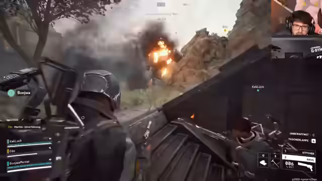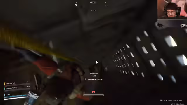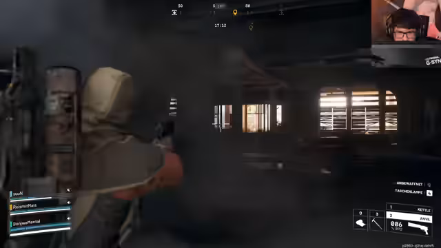 04:35:02Die Spieler befinden sich in einem intensiven Feuergefecht, wobei ein Gegner mit einem Schildbruch gemeldet wird. Die Kommunikation konzentriert sich auf die Positionierung der Gegner, insbesondere auf einen Schützen an einer Säule und einen weiteren in der Ferne. Die Umgebung ist von Gas erfüllt, was die Sicht und Bewegung der Spieler stark beeinträchtigt und zu Stamina-Verlust führt. Es wird über die beste Waffe für den Nahkampf diskutiert, während ein Gegner auf der Treppe mit Schildbruch identifiziert wird. Die Spieler versuchen, sich zu heilen und fallen taktisch zurück, um sich neu zu formieren. Die Gegner werden als an der Slayer-Position vermutet und es wird überlegt, ob sie sich im unteren Bereich oder außerhalb des Gebäudes befinden. Ein blinkendes Licht hinter den Spielern deutet auf weitere Aktivitäten hin, und es wird die Möglichkeit eines schnellen Vorstoßes in Betracht gezogen, um einen Gegner ohne Schild zu eliminieren. Die Option, über eine Zipline oder durch Klettern eine höhere Position zu erreichen, wird diskutiert, um einen taktischen Vorteil zu erzielen.