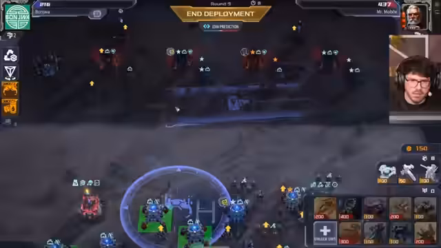 02:15:32Der Tower geht unter Beschuss down, und die gegnerischen Einheiten one-shotten die eigenen. Die Runde geht verloren. Es wird überlegt, ob eine Multi-Schmelze besser gewesen wäre. Crawler Production Schmelze wird als gut erachtet, wenn Kämpfe lange dauern. Es wird nach einer Option gesucht, Replays anzusehen, um die Auswirkungen einer Multischmelze besser beurteilen zu können. Saugen hilft nichts gegen die hochgelevelten Fortresses. Es wird überlegt, Tanks und Crawler einzusetzen, aber die einseitige Vorschläge des Spiels werden kritisiert. Es wird versucht, mit Multischmelzen entgegenzuwirken. Die erste Runde geht komplett verloren, beide Seiten werden eingenommen. Es wird überlegt, etwas vor die Einheiten zu stellen, um sie vor Snipern zu schützen. Phoenix Runde 2 als Elite ist überraschend und stark. Ein Tower geht down. Es wird ein Tank beschworen, aber es gibt nichts, was gegen Phoenix hilft. Es wird überlegt, Mustangos einzusetzen. Der Gegner spielt einen Vulkan auf der Seite, wo der Tank nicht ist, was zum Verlust der Mustangs führt. Die Mustangs können jedoch beide gegnerischen Einheiten ausschalten, was als positiv bewertet wird. Ein weiterer Tank wird benötigt, um den Vulkan in Schach zu halten. Es wird überlegt, Sniper zu bauen, aber die Entscheidung fällt schwer.