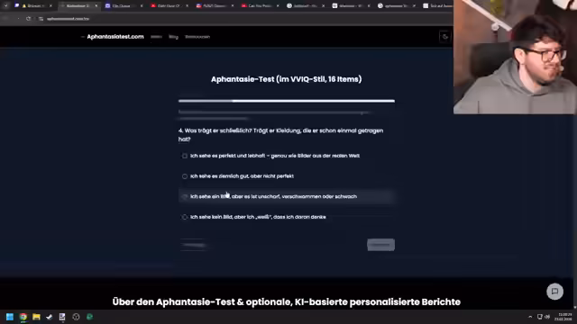 04:55:20Ein Test zur Selbstüberprüfung, der auf dem Konzept der A-Fantasie basiert, wird durchgeführt. Der Streamer erkennt Gesichter, wie das eines Freundes, kann sie aber nicht bildlich vorstellen. Dies unterstreicht seinen Glauben, dass seine visuellen Fähigkeiten stark eingeschränkt sind. Das Ergebnis bestätigt eine mögliche Aphantasie, was ihn in eine tiefe existenzielle Verwirrung stürzt, in der er sich als 'Superloser' fühlt.