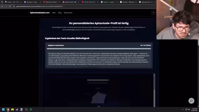 05:14:19Das Ergebnis des Aphantasie-Tests besagt, dass der Streamer eine sehr schwache willentliche, visuelle Vorstellungskraft hat, was Aphantasie entspricht. Es wird betont, dass dies keine Störung, sondern eine kognitive Variante ist. Der Streamer ist jedoch verwirrt, da er sich selbst als visuellen Denker beschreibt, der aber nichts sieht. Dies wirft ein Schlaglicht auf neurologische Vielfalt und die Tatsache, dass es kein einheitliches 'normales' Denken gibt.