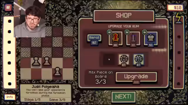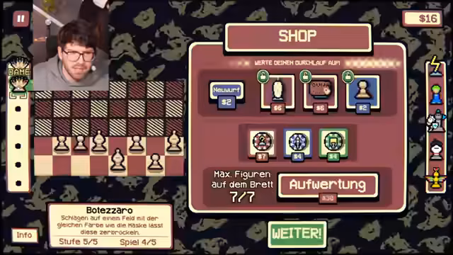 06:19:15Der Streamer erhält 9 Dollar und erwägt, sein Board zu upgraden, hat aber nicht genug Geld. Er bemerkt, dass wenn eine der Gegnerfiguren eine Königin ist, sie drei Pawns wert ist. Ein Phantom Piece wird vorgestellt, das für 0$ verkauft wird und am Ende des Spiels verschwindet. Der Streamer erfährt, dass eine Figur nur dann eine Phantom-Dame wird, wenn sie auf einem weißen Feld capturet. Eine Phantom Tile hat eine Drittel Chance, auf einem weißen Feld zu capturen, was aber selten ist. Der Streamer re-rolt und erwägt, eine Figur zu verkaufen.