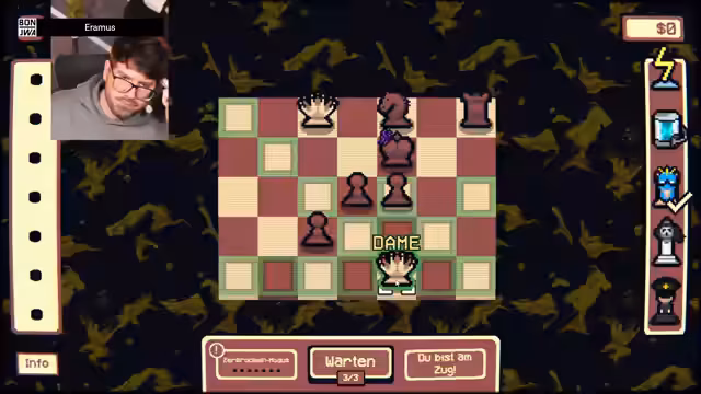 06:24:04Der Streamer muss eines von drei Gambits gleicher Seltenheit wählen: Common, Rare, Epic oder Legendary. Er entscheidet sich für die Fork und das Upgrade. Er erfährt von Judith Polgaischer, Stage 1 von 5. Diese Figur kann nur als letzte geschlagen werden. Der Streamer stellt seine Figuren auf das Brett und hofft, durchcapturen zu können. Er zieht vor, wenn gegessen wird, und durch, wenn nicht. Er möchte recapturen, falls eine Figur genommen wird.
