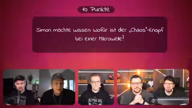 04:19:54Die Quizshow startet mit dem ersten Spielmodus: Fragen werden aus der Community gestellt. Das Team von Leon und Matteo beginnt und muss die Frage, was 'unterm Schwanz treffen' bedeutet, beantworten. Nach einer falschen Antwort gibt es Tipps, bis das Team den richtigen Treffpunkt unter einem Pferdendenkmal in Hannover errät. Das zweite Team von Donny und Flo muss die Frage nach dem Chaos-Knopf bei einer Mikrowelle lösen und findet nach technischen Erklärungen zur physikalischen Funktionsweise der richtigen Begriff.