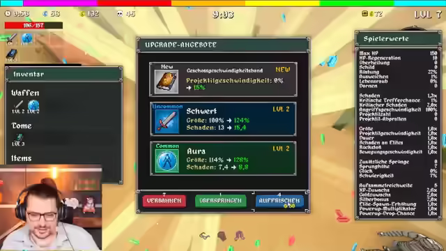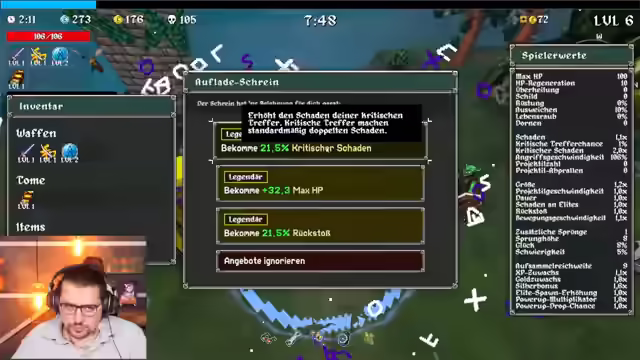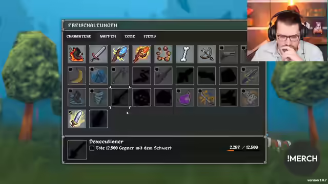 00:35:37Es wird nach einem Termin für einen Disney-Screen gefragt, der aber noch nicht feststeht, da nächste Woche die Polaris ansteht und viele andere Sachen geplant sind. Der Streamer verspricht, den Disney-Screen zeitnah zu machen. Es wird nach einem FTL-Run gefragt, aber der Streamer verweist auf Mateo. Es wird ein Questrun gestartet, um den Banditen freizuschalten, wofür 12.500 Kills mit dem Schwert benötigt werden. Der Streamer wählt den Sir als Charakter und versucht, schnell viele Kills zu erzielen. Es werden verschiedene Items und Fähigkeiten freigeschaltet, darunter der Cursed Tome und ein zusätzlicher Sprung. Der Streamer plant, den Anvil mit drei Herausforderungen zu spielen und wählt die Speedrunner-Herausforderung mit 30 Minuten Zeit zum Gewinnen. Es wird überlegt, ob mehrere Challenges gemacht werden sollen, aber der Streamer entscheidet sich für nur eine. Es wird überlegt, ob die vierfache Gegnerskalierung eine gute Wahl ist, um viele Kills zu erzielen. Listup wird als nützlich zum Clearen angesehen und der Streamer findet ein Helden-Shirt. Es wird überlegt, Glück oder XP gegen Projektile als Tome zu tauschen, aber für den aktuellen Questrun verworfen.
