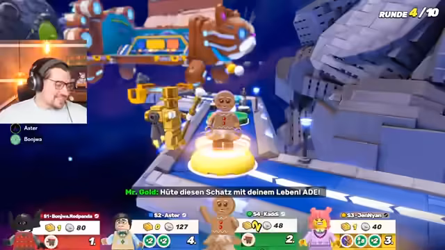 02:44:53Die Gruppe startet die Lego Party im Herausforderungsmodus mit goldenen Steinen. Sie wählen die Raumzone als Map, die an Star Wars erinnert, und stellen die Spielzeit auf 90 Minuten ein. Es gibt anfängliche Schwierigkeiten mit der Steuerung, da der Streamer zwischen Tastatur und Controller wechseln muss. Sie entdecken verschiedene Minispiele, darunter einen Parcours, bei dem man Hindernissen ausweichen muss. Asta gewinnt die erste Runde, was zu Diskussionen über die Gameplay-Mechaniken führt, insbesondere wie man goldene Steine erhält. Sie spielen weitere Minispiele, wie ein Downhill-Rennen, bei dem man Bäumen ausweichen muss, und ein Golfspiel, bei dem man den eigenen Ball ins Ziel bringen muss. Es kommt zu chaotischen Momenten, bei denen sich die Spieler gegenseitig behindern. Der Streamer und seine Freunde haben viel Spaß, obwohl es auch frustrierende Momente gibt, wie das 'Eisspiel', das als das schlechteste Minispiel empfunden wird. Sie landen auf verschiedenen Feldern, die Boni wie kostenlose Steine oder Einkaufsgutscheine bieten, und versuchen, möglichst viele goldene Steine zu sammeln.