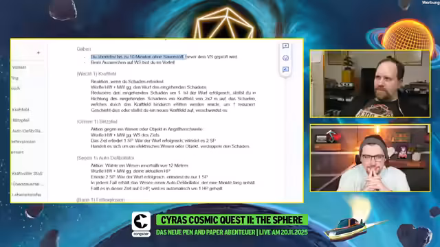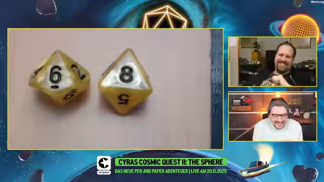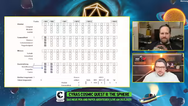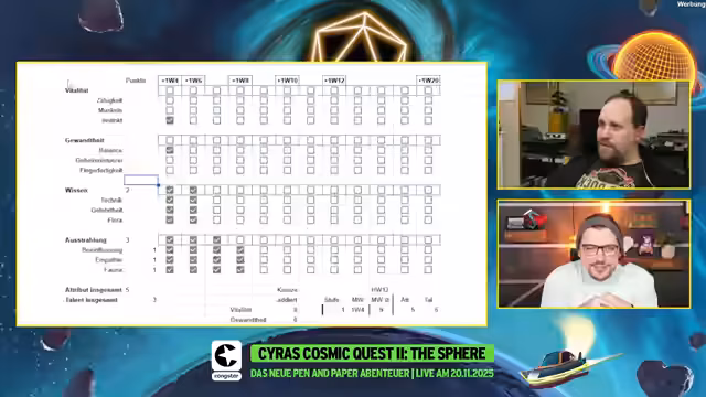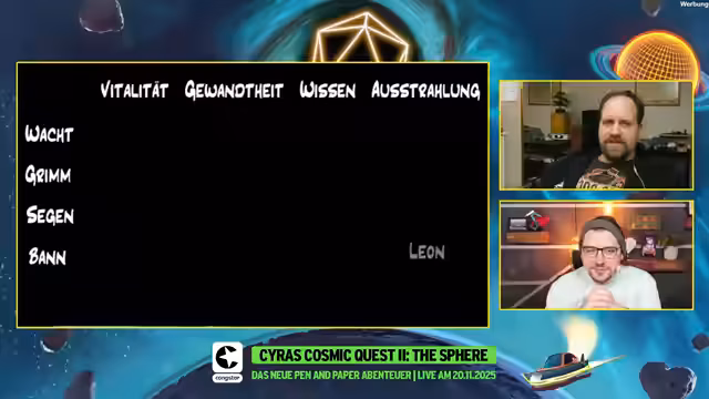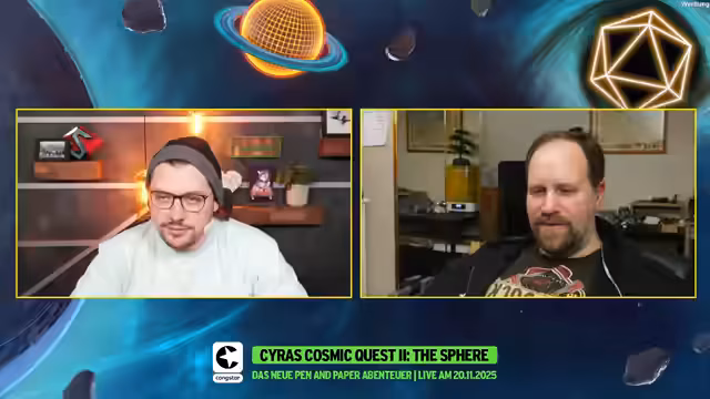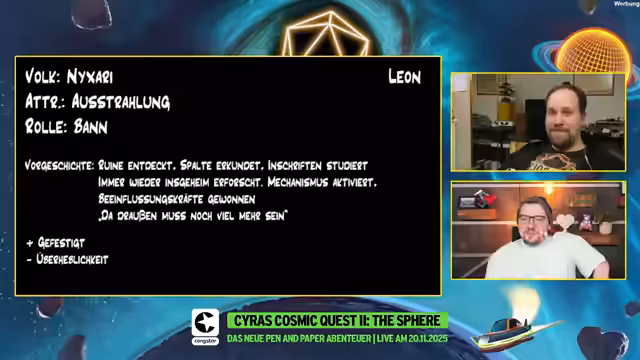 04:54:25Nach dem Abschluss der Gaming-Session beginnt die Charaktererstellung für das bevorstehende Kongstar Pen & Paper Event. Der Spielleiter Alex, der bereits das letzte Pen & Paper geleitet hat, wird vorgestellt. Er hat Musikerziehung studiert, konzentriert sich aber seit über 15 Jahren auf Tischrollenspiele und leitet regelmäßig Dungeons & Dragons sowie sein eigenes System. Alex erwähnt seine Arbeit mit Synchronsprechern bei den Dice Actors, darunter Tim Schwarzmeier und Rikke Werner. Das Event, Syrah's Cosmic Quest 2: The Sphere, findet am 20. November um 19 Uhr statt und wird das Kongstar-Stream-Team sowie Maxim, Kaddi und Jen umfassen. Es wird ein aufwendiges Set im Studio aufgebaut und die Spieler werden verkleidet, um vollständig in ihre Rollen einzutauchen. Alex betont, dass die Geschichte an die Charaktere angepasst wird, um ein einzigartiges Spielerlebnis zu schaffen. Die Spieler tauschen sich über ihre bisherigen Pen & Paper Erfahrungen aus und freuen sich auf die kommende Kampagne, die auf den Ereignissen des letzten Events aufbaut, bei dem der Computerkern von Syrah gestohlen und ein mechanischer Parasit besiegt wurde. Die Vorbereitungen laufen auf Hochtouren, um technische Hürden zu überwinden und ein reibungsloses Erlebnis für alle Beteiligten zu gewährleisten.