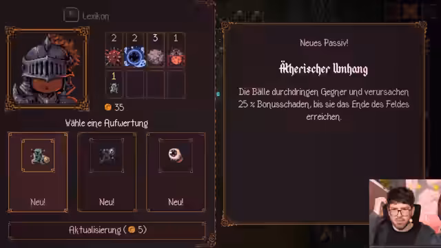 01:38:09Nach dem gescheiterten Minecraft-Speedrun wechselt der Streamer zu "Balls Pit", einem Spiel, das er bis 18 Uhr spielen möchte. Er erklärt das Spielprinzip: Man bewegt sich auf einer Lane, besiegt Gegner, sammelt XP wie in Vampire Survivors und schießt Bälle als Waffen. Bei Level-Ups kann man neue Bälle oder Upgrades auswählen. Der Streamer spielt einen Charakter namens "Nachdenker", der Power-Ups automatisch auswählt, was ihn überrascht und als "crazy" bezeichnet wird. Normalerweise wählt man die Upgrades selbst, um Synergien zu schaffen oder Waffen zu fusionieren, um stärkere Versionen freizuschalten. Er entdeckt, dass der Nachdenker 30% der Zeit als "brillanter Philosoph" fungiert und Upgrades automatisch wählt. Trotz der automatischen Auswahl schafft er es, Laser zu fusionieren und Fortschritte zu erzielen. Er kritisiert die Entscheidungen des Nachdenkers, da dieser nicht immer die besten Upgrades wählt, was zu einem knappen Sieg bei einem Doppelboss führt. Nach dem Run kann man mit gesammelten Ressourcen neue Gebäude bauen, um Werte wie Geschick, Respekt oder Energie zu erhöhen und neue Charaktere freizuschalten. Er startet einen weiteren Run mit dem Nachdenker, um einen Endboss zu besiegen, und hofft auf bessere Upgrade-Entscheidungen.