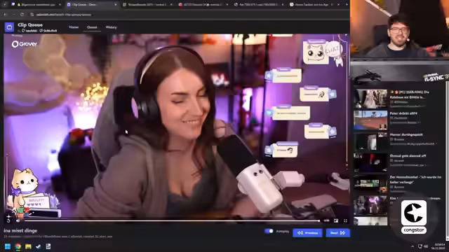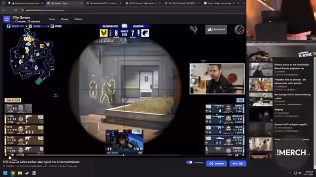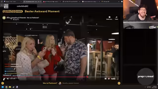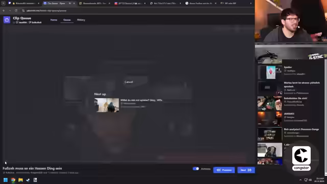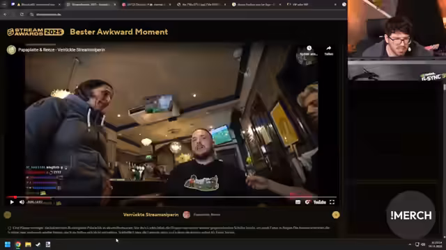 07:35:51Die Clips für heute sind beendet, und der Streamer kündigt an, die restlichen Clips morgen anzusehen. Es wird in die 'Stream Awards' gewechselt, wobei der Streamer sich besonders für die Kategorien 'Cringe' und 'Fails' interessiert, da er 'Rage-Momente' als 'cringe' empfindet. Ein 'Real-Life-Moment' wird gezeigt, in dem eine Frau sich vehement dagegen wehrt, gefilmt zu werden, obwohl sie sich auf einer öffentlichen Veranstaltung befindet. Sie fordert die Löschung der Aufnahmen und verlangt 'Datenschutzpapier', während sie sich immer wieder vor der Kamera positioniert. Der Streamer findet die Situation humorvoll und bezeichnet sie als 'gut' und passend für die Kategorie 'Cringe'. Es folgt ein weiterer Clip, in dem ein Mann einen Gegenstand schüttelt und die Zuschauer im Chat reagieren. Die Diskussion über die 'größte Sicherheitslücke der Welt' und ein 'riesiges Stahltor, was einfach komplett für den Arsch ist', wird humorvoll fortgesetzt.