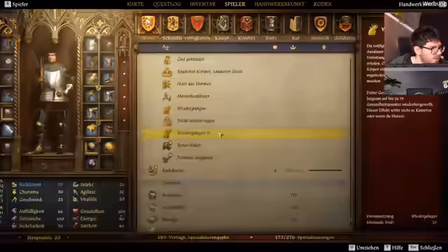 07:55:46Heinrich, der Protagonist, erhält den Auftrag, Albich von Unitschow zum Kloster Sedletz zu begleiten, um König Wenzel zu untersuchen, der angeblich krank ist. Der Streamer entdeckt, dass der Spielstand viele ungenutzte Skillpunkte hat und beginnt, diese zu verteilen. Er konzentriert sich auf Stärke- und Agilitätsskills wie 'Stark wie ein Ochse' für erhöhte Tragekapazität und 'Fliegengewicht' zur Reduzierung von Fallschaden. Er bemerkt, dass einige Skills andere ausschließen und muss strategisch vorgehen. Nach einer kurzen Auseinandersetzung, bei der er einen Gegner besiegt, wird er von den Wachen gesucht und muss sich verstecken. Er entscheidet sich, die Leiche zu beseitigen, um keine Spuren zu hinterlassen, und nutzt die Wartefunktion, um die Verfolgung abzuschütteln.