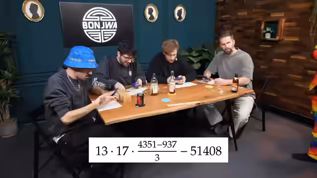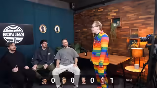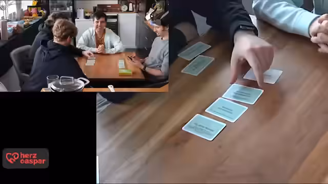 04:00:15Die Spieler diskutieren intensiv über die beste Strategie im aktuellen Kartenspiel, bei dem es darum geht, Ereignisse chronologisch zu ordnen. Es wird überlegt, ob man Yannick gewinnen lassen oder selbst weiterspielen soll. Ein Spieler erinnert sich an eine alte Schuld, bei der er um 7 Uhr morgens aus dem Bett geholt wurde, und versucht, dies nun im Spiel zu seinem Vorteil zu nutzen. Es entsteht ein Bieterstreit um die Gunst eines Mitspielers, wobei humorvoll die Aufgabenverteilung bei Bonjwa angesprochen wird, wie das Wechseln von Fugen oder das Erklären des Studios. Die Spieler versuchen, sich gegenseitig zu verunsichern und Fallen zu stellen, um den Gegner zu einem Fehler zu verleiten.