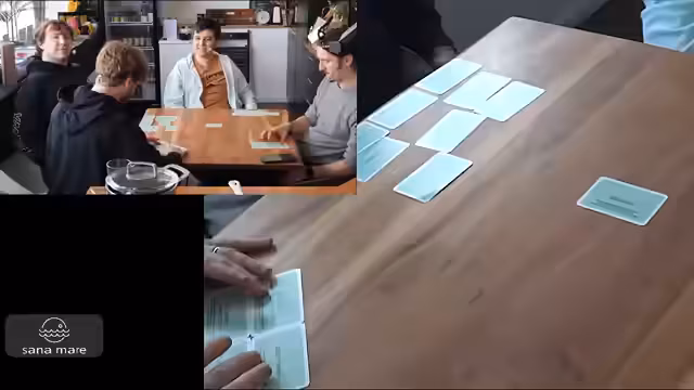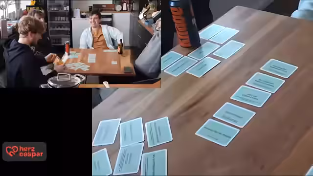 03:15:36Die Spieler diskutieren intensiv über die Regeln eines Kartenspiels, insbesondere über das Anzweifeln von gelegten Karten und die Konsequenzen von Fehlern. Es wird geklärt, dass ein Fehler, der nicht angezweifelt wird, stillschweigend akzeptiert wird und sich durch das Spiel ziehen kann. Die Spieler beschließen, ein Testspiel zu starten, um die Regeln besser zu verstehen und zu verinnerlichen. Dabei werden erste Karten wie 'Codex ersetzt Schriftrollen', 'Fall Guys' und 'Counter-Strike' gelegt, und die zeitliche Einordnung dieser Ereignisse wird besprochen. Die Positionierung der Kamera wird angepasst, um eine bessere Sicht auf das Spielfeld zu ermöglichen.