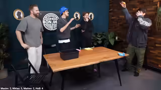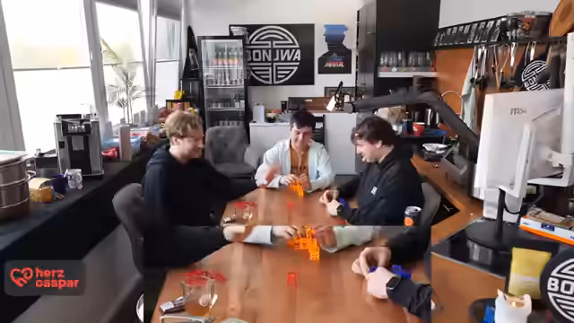 05:19:16Nach einer intensiven Spielrunde wird ein entspannteres Minispiel eingeführt: Stühle stapeln. Die Teilnehmer versuchen, kleine Plastikstühle so aufeinanderzustapeln, dass ein stabiler Turm entsteht. Es ist eine Herausforderung für Geschicklichkeit und Gleichgewicht. Die Spieler experimentieren mit verschiedenen Techniken, wie dem Stapeln von Bein auf Bein, was sich als schwierig erweist. Die Atmosphäre ist locker und humorvoll, während die Spieler versuchen, sich gegenseitig zu übertreffen und gleichzeitig die Regeln des Spiels zu verstehen. Trotz der anfänglichen Schwierigkeiten und des häufigen Scheiterns, bei dem die Türme immer wieder umkippen, haben die Teilnehmer sichtlich Spaß. Dieses Minispiel dient als unterhaltsame Pause und zeigt eine andere Seite der Interaktion zwischen den Streamern, die von strategischem Denken zu spielerischer Leichtigkeit wechselt.