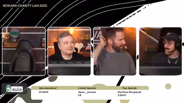 02:51:45Bonjwa plant, die neue Fläche auch für zusätzliche Streams am Freitag zu nutzen, insbesondere wenn Asta dort streamen möchte. Es wird betont, dass die Zusammenarbeit mit externen Partnern und die Integration der neuen Fläche eine große logistische und technische Herausforderung darstellt. Im Rahmen der Spendenaktion werden drei Organisationen unterstützt: Aula, die sich für Demokratiebildung an Schulen einsetzt und mit Marina Weißband eine Videoschalte plant; Sanamare, die Plastik aus Meeren und Flüssen holt und gleichzeitig Armut bekämpft, da dies als nachhaltiger Ansatz zur Lösung der Plastikkrise gesehen wird; und Herzkasper, die Kindern und Jugendlichen in Krankenhäusern eine schönere Zeit ermöglichen. Die Spenden werden über Betterplace gesammelt, was den Prozess vereinfacht und Spendenquittungen ermöglicht. Es wird hervorgehoben, dass jede Spende hilft und dass es auch in Ordnung ist, nicht zu spenden, wenn man es sich nicht leisten kann, da die Unterhaltung kostenlos angeboten wird.