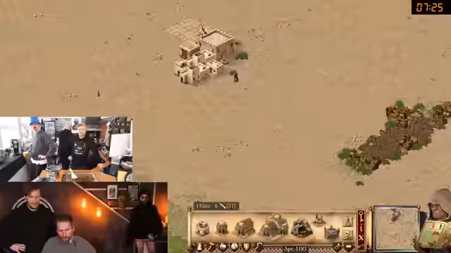 07:24:29Die Gruppe beschließt, die Wette in Stronghold Crusader Definitive Edition zu starten, bei der Niklas gegen den KI-Gegner 'Die Ratte' antritt. Die anderen Teilnehmer wetten, wie lange Niklas überleben oder ob er gewinnen wird. Es wird festgelegt, dass für jede Minute, die Niklas überlebt, 10 Euro von jedem gewettet werden. Die Stimmung ist ausgelassen und humorvoll, während Niklas versucht, das Spiel zu verstehen und seine Basis aufzubauen. Er hat Schwierigkeiten mit den grundlegenden Mechaniken wie dem Bau von Gebäuden, der Ressourcenverwaltung und der Steigerung der Beliebtheit seiner Bevölkerung. Die anderen kommentieren seine Aktionen und geben ihm teilweise widersprüchliche oder verwirrende Ratschläge, was zu weiteren komischen Situationen führt. Die Zuschauer im Chat verfolgen gespannt das Geschehen und geben ebenfalls Tipps oder machen sich lustig. Die Herausforderung für Niklas besteht darin, seine Burg zu verteidigen und gleichzeitig seine Wirtschaft aufzubauen, während er mit den Eigenheiten des Spiels und den Kommentaren seiner Mitspieler zurechtkommen muss. Die Uhr läuft und die Spannung steigt, wie lange Niklas gegen die Ratte durchhalten wird.