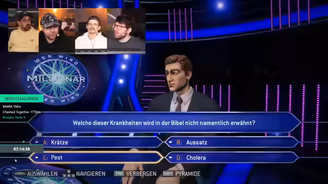 07:12:53Nach längerer Diskussion über verschiedene Spiele und die Möglichkeit einer 'Win Challenge' werden konkrete Vorschläge gemacht. Es wird vorgeschlagen, 'Are We There Yet?' zu spielen, ein Spiel, das Max bereits mit Sebastian aufnehmen wollte, aber Sebastian hat bereits eine andere Gruppe. Die Teilnehmer schlagen abwechselnd Spiele vor, darunter 'Morthau' im PVE-Horde-Modus, wobei 10 Subs als Wetteinsatz für das Bestehen der Challenge angeboten werden. Ziel ist es, ein Spiel zu finden, das die Gruppe zusammenschweißt, im Gegensatz zum letzten Jahr, wo es viel Provokation gab. Weitere Vorschläge sind 'PUBG' und 'Age of Mythology'. Schließlich wird beschlossen, eine 'Win Challenge' mit 'Morthau' und 'PUBG' zu starten. Als drittes Spiel wird 'Are We There Yet?' in Betracht gezogen, mit dem Ziel, bis zum Sumpf zu kommen. Die Gruppe einigt sich auf drei Spiele für die Challenge. Es wird auch eine Wette vorgeschlagen, bei der Niklas in Stronghold gegen den Gegner 'Die Ratte' antreten soll, während die anderen kommentieren und sich lustig machen. Niklas' E-Sport-Vergangenheit wird dabei humorvoll thematisiert, und seine geringen Einnahmen aus Turnieren werden aufgedeckt.