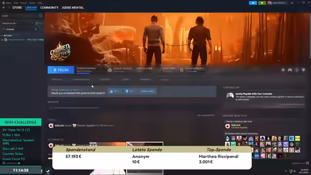 17:45:57Die Spieler starten Chained Together, ein Spiel, das Koordination und präzises Timing erfordert, da sie alle an einer Kette hängen. Trotz der anfänglichen Schwierigkeiten und der Tatsache, dass einige Spieler das Spiel noch nie gespielt haben, versuchen sie, die 1500-Meter-Marke zu erreichen. Die Herausforderung des Lava-Modus wird diskutiert, aber letztendlich wird im normalen Modus gespielt. Technische Probleme mit der Maus und der Charakterauswahl erschweren den Start für einen der Spieler. Es wird schnell klar, dass die Kommunikation und das Absprechen von Sprüngen entscheidend sind, um nicht herunterzufallen. Die Spieler versuchen, eine effektive Kette-Formation zu finden und sich gegenseitig hochzuziehen. Trotz wiederholter Stürze und der Notwendigkeit, von vorne zu beginnen, bleiben sie motiviert und versuchen, ihre Taktiken zu verbessern. Die Bedeutung des Countdowns und des synchronisierten Springens wird erkannt, um die Hindernisse zu überwinden. Die Spieler lernen, vorsichtig zu sein und nah beieinander zu bleiben, um die Kette nicht zu überdehnen. Die Versuche, einen „Tickler“ auf der Tastatur zu machen und die richtige Formation zu finden, zeigen den humorvollen Umgang mit den Schwierigkeiten des Spiels. Trotz der Herausforderungen und der anfänglichen Rückschläge bleiben die Spieler entschlossen, die Win-Challenge zu meistern und das Spiel erfolgreich abzuschließen.