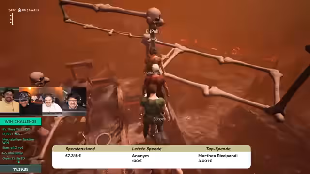 19:46:34Die Spieler müssen sich bei einer besonders kniffligen Stelle konzentrieren, die als „Scheißstelle“ bezeichnet wird. Trotz anfänglicher Schwierigkeiten, bei denen ein Spieler „reingeschissen“ hat, versuchen sie, die Passage gemeinsam zu meistern. Die Notwendigkeit von Teamwork und präziser Ausführung wird deutlich, da jeder Fehltritt zum Absturz führen kann. Die Gruppe motiviert sich gegenseitig, um diese Herausforderung zu überwinden und den Fortschritt im Spiel zu sichern, wobei sie sich auf genaue Absprachen und das Timing der Sprünge verlassen.