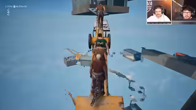20:43:14Die Spieler müssen auf Reifen springen und laufen, um sich fortzubewegen, was ein Gefühl von „mega geil“ vermittelt. Anschließend werden sie mit einem Magneten konfrontiert, der sie hochzieht. Es wird diskutiert, ob man sich festhalten muss oder automatisch hochgezogen wird. Die Gruppe entscheidet sich, zusammenzubleiben und abzuwarten, bis der Magnet sie mit dem „Müll“ nach oben befördert. Eine weitere Herausforderung sind verschwindende Plattformen, die nur aktiv bleiben, solange ein Spieler darauf steht. Die Mechanik wird als „dumm“ empfunden, da die einzige Gefahr darin besteht, dass alle gleichzeitig abspringen und die Plattformen verschwinden. Die Spieler müssen sich absprechen und nacheinander springen, um die Plattformen aktiv zu halten und sicher voranzukommen. Die Koordination und das Timing sind hierbei von größter Bedeutung, um nicht in die Tiefe zu stürzen und den Fortschritt zu verlieren.