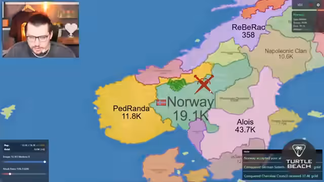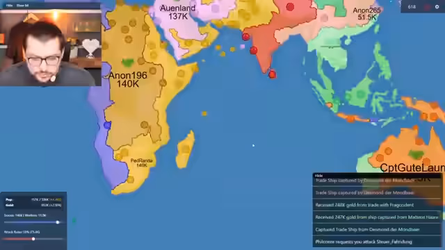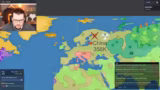 00:26:39Nach der Vorstellung startet der Streamer eine gemeinsame Partie mit dem Chat und greift auf der Karte Europa. Seine anfängliche Taktik besteht darin, schnell neutrale Gebiete zu erobern, um Land und Bevölkerung zu gewinnen. Er schließt erste Allianzen mit Chat-Nutzern, die jedoch schnell verraten und ihm den Rücken zukehren. Dies führt zu heftigen Kämpfen auf mehreren Fronten. Er beschreibt die zermürbende Erfahrung, ständig von Verbündeten angegriffen zu werden und seine Strategie anpassen zu müssen, um nicht sofort eliminiert zu werden.