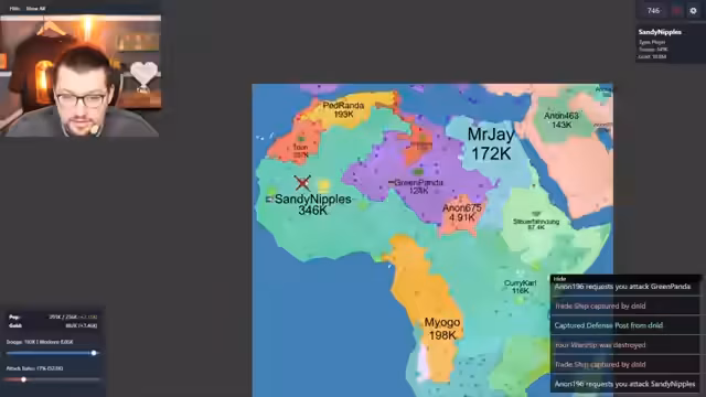 01:40:14China setzt seine Expansion fort und erobert große Landstriche wie Australien, was von allen Spielern als extrem aggressiv empfunden wird. DNL wird als ein weiterer starker Akteur identifiziert, der ebenfalls massiv wächst. Der Streamer selbst ist in einen Machtkampf verwickelt, bei dem er sich unter anderem mit Eulenektar verbündet, um die Dominanz von China und anderen zu bekämpfen. Die Situation ist geprägt von ständigen Angriffen, Gegenangriffen und dem Einsatz von Nuklearwaffen.
