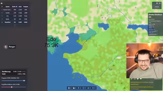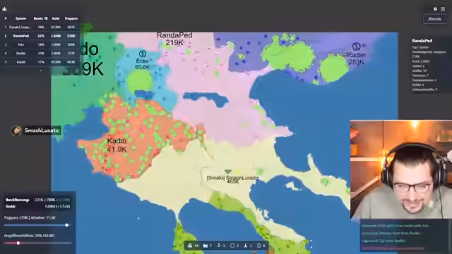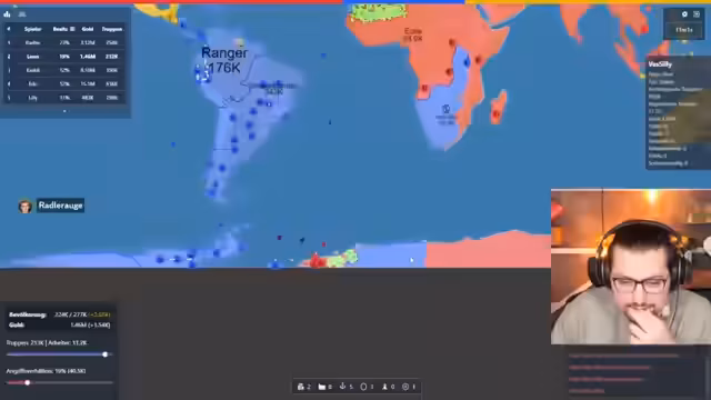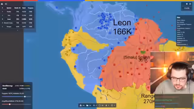 02:55:31Nach einer Phase der defensiven Rückzüge und strategischer Neuorientierung beginnt der Streamer, sich wieder in das Spiel zu kämpfen. Er analysiert die aktuelle Lage und versucht, seine Wirtschaft auszubauen, indem er Fabriken und Städte baut. Immer noch ist er von starken Gegnern wie Franzi, Edo und Vasily umgeben. Die Konflikte spitzen sich zu, als er versucht, seinen Einfluss zu vergrößern und sich in das Spielgeschehen wieder einzubringen, indem er sich gezielt gegen bestimmte Spieler wendet.