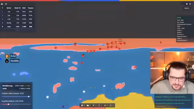 03:51:11Nach der Runde wird das Spielgeschehen analysiert. Ein Spieler scheint eine Geldmaschine gebaut zu haben, die Millionen pro Sekunde generiert. Es wird über Mechaniken wie das schnelle Senden von Truppen und den Aufbau von Raketenabwehr diskutiert. Streamer und Chat stellen fest, dass eine aggressive Expansion und schnelle Wirtschaftsentwicklung entscheidend für den Sieg sind, während defensive Fehler oft zur Niederlage führen.