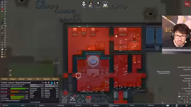 06:41:45Der Stream beginnt mit der Analyse der Siedlungsstruktur. Die Kolonie muss Überlebensrationen herstellen, was Kochen Stufe 8 erfordert, was jedoch noch nicht möglich ist. Daher werden zunächst Charskills für Kochen priorisiert. Es gibt Mangel an Nahrungsmitteln und Tieren. Ein neues Mitglied, Kim, wird eingestellt. Gleichzeitig besteht das Problem, dass die Schiffstriebwerke schutzbedürftig sind, da ein Angriff droht, der zur Zerstörung führen würde. Der Streamer plant, die Düsen einzumauern, stößt dabei aber auf bauliche Hindernisse, da die Bodenplatten im Weg sind. Es werden Lösungen wie das Entfernen von Fundamenten oder der Bau von Wänden ohne Boden und Dach diskutiert. Die Jagd auf ein Kamel beginnt und Kim frisst später eine Leiche.